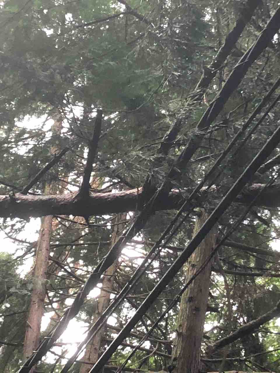 当地も朝から雨ですが、幸いに豪雨、強風のレベルではなく、今日も粛々と作業が行われ、大物であるモミの木が、我が家の屋根を見事に跨いで行きました。