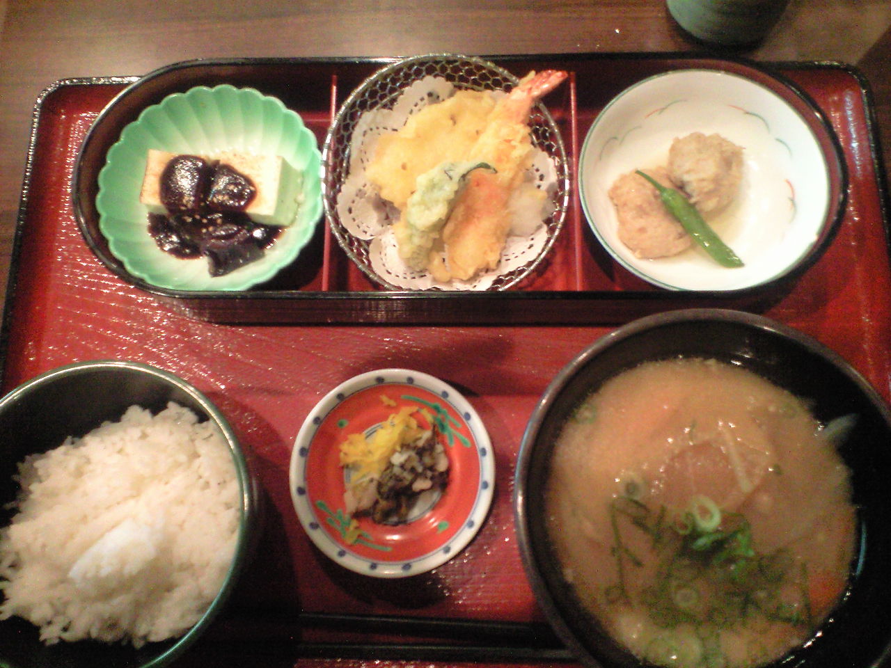 思い残すことなく京都駅に向かい、空腹を満たしたのは、八条口の側にあるニュートーキョーの店「くらま」。こちらの具沢山汁膳というのが大正解。780円とお手ごろ価格ですが、味付けもよく、天ぷらなぞもカリッとしていたし、お汁もたっぷり。駅ビルと言うことであまり期待せずに入ったのですが、思いがけず美味しかったです。