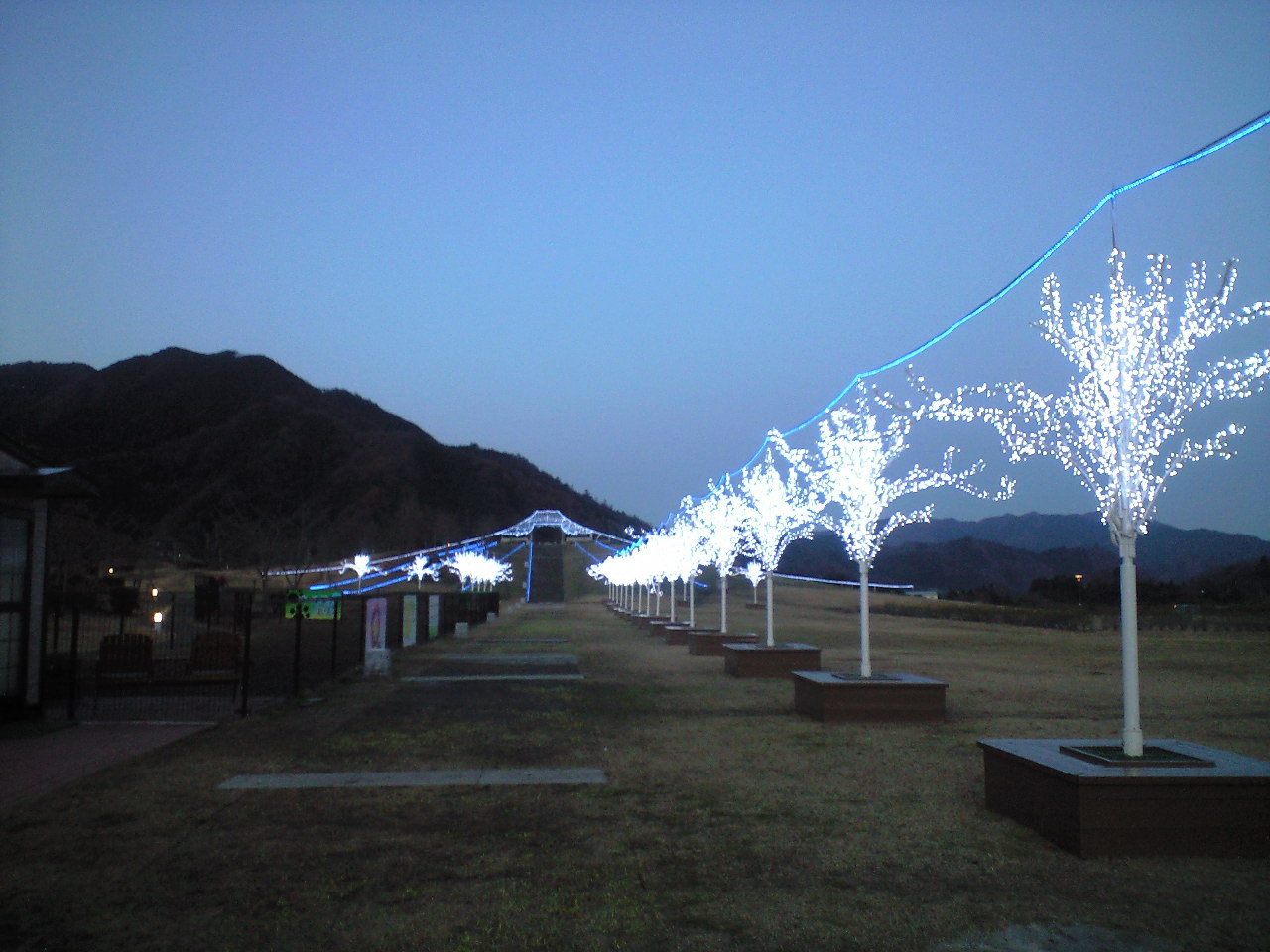 なかなか寒々しい夕暮れの中、白いイルミネーションの奥には富士山型電飾も見えて、山梨ならではという感じでした。