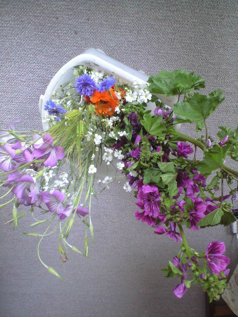 午後、友人宅にお茶にうかがうことが分かっていたので、玄関先に飾ったのも含め、これだけの花を買ったのです。いずれも1束100円でお庭から採り立 て? ザワザワ元気そうです。勿論、ダックワースも持って行き、別途、用事があってお茶会に参加出来ない近所の友人が焼いてくれた伊予柑フィリングのパイ を持って行ったら、喜んで貰えましたよ〜。