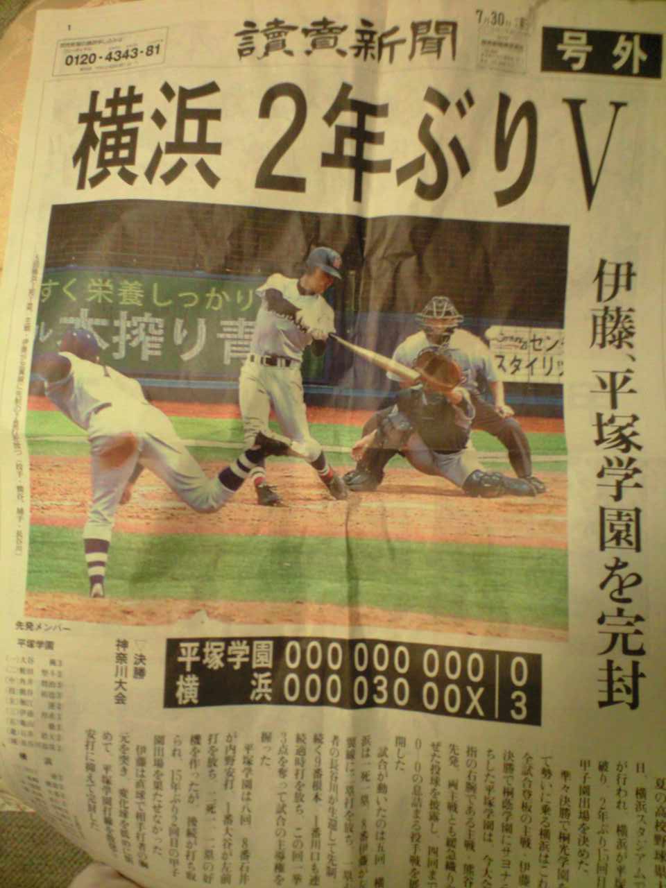 夏の高校野球の県代表が決まった。2年ぶりに横浜高校が選出!というものでございました。どこかが決まるのは決まっているんだし、初出場チームならばともかく、強豪のたった2年ぶりの甲子園行き決定じゃん。何も号外まで・・・というのが正直な感想ですが、ま、いわば地元ネタって事ですかね?(対戦した平塚学園は平塚市・・・すなわち茅ヶ崎と小田原の間で、かなり県西部)