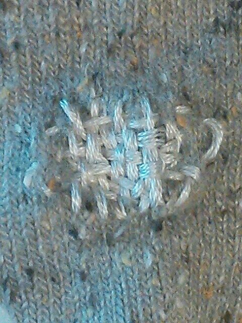 ネップヤーンでウール混紡は、足癖の悪い人間は、耐久性の面で履いてはいかんと分かったのは別として、こんな感じに穴を塞ぎました。