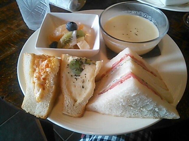 サンドイッチセットです。季節のスープ(今日頼んだのは冷製コーンスープ。美味!)手作りの美味しいサンドイッチと、フルーツヨーグルトがワンディッシュになっていて、ソフトドリンクが付きます。これで1000円なのは、観光地と雰囲気から考えたら、かなりコスパいいよね〜。