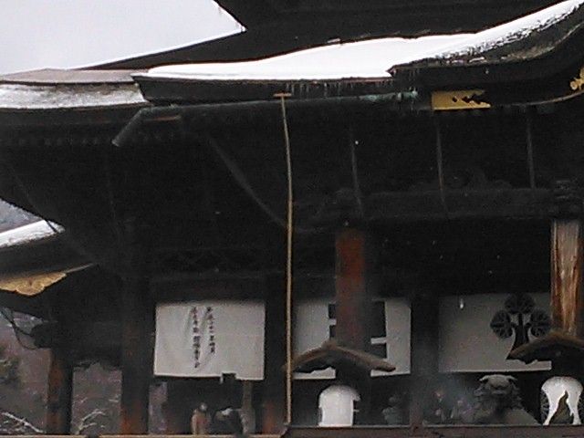 ところで、善光寺、長大竹竿の上に板がくっついたように見えるモノで屋根の雪はらいをしていました。参拝者が突如落下する雪でケガをしないようにという配慮かと思います。