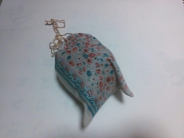 なんのこっちゃない、単なる袋です。残り布に、断捨離しないで後生大事に持っていた紐がここで役立ちました。何年寝かせてたんだろう(^^ゞ。でも、駅そばスーパーが閉店し、この1年とみに買い物の便が悪くなった我が家では、こういう「捨てないで取っておく」が役立つことがたまにはあるので、ますます捨てられません。