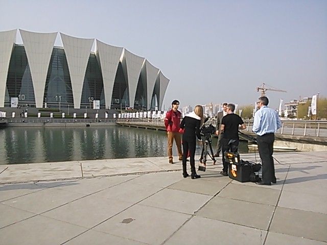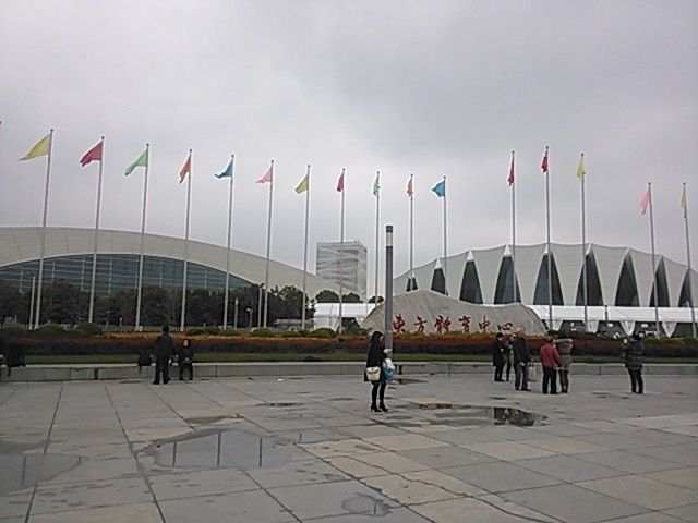 上海アリーナは地下鉄11号線の東方体育中心下車すぐでして、まだ新しさ感がいっぱいのきれいな建物でした。足もとに水たまりが出来ているのは雨上がりだからですが、水はけ設計はいまいちのようです。