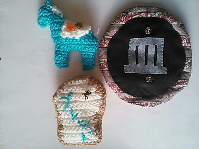 ↑ 皿ブレッド2号 ところが・・・不器用な私にはぬいぐるみの食パンは思いのほか難しく、市民図書でたまたま見かけた「初心者向けかわいい北欧風かぎ針編み」の本に載っていた食パンを編み、さらにどう見てもサラブレッドではないポニーもおまけに付けるという事と相成りました。これはSPで投げ込み。
