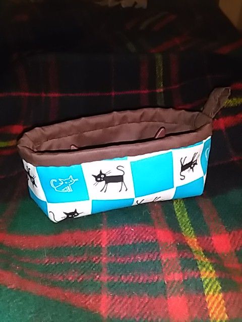 布地は先生である友人提供。たまたま私が愛用している、かなり前の京都手づくり市で買った移動ポケット(以前はバッグポケットと呼んでいましたが、どうやら移動ポケットで定着のようですね)の図柄と共通の猫ちゃんなので、選びました。シックなのもいいんですが、ぱっと目に付くのにしないと、そもそもメガネ置き自体をどこに置いたかわからなくなるという・・・(^^ゞ