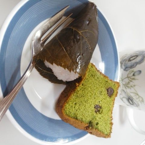 洋風スィーツだけじゃなくて、和風スィーツも上手な友人による道明寺の桜餅に小倉抹茶ケーキ。それに抹茶入り玄米茶でおいしくいただきました。