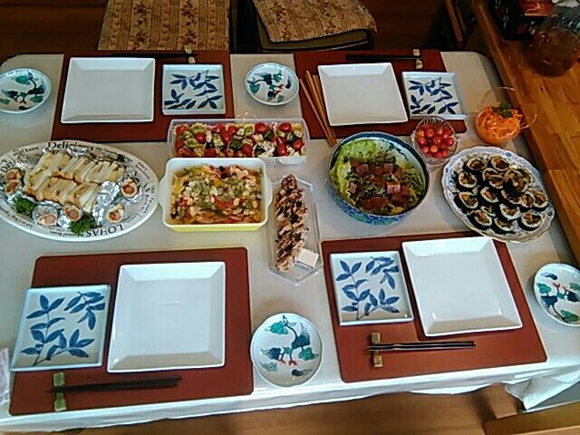 持ち寄りランチですが、手抜きな私と違い、ホステスの友人はもちろん、あと二人の友人もそれぞれカラフルでおしゃれな、あるいは力作を提供、こんなに華やかな食卓になりました。