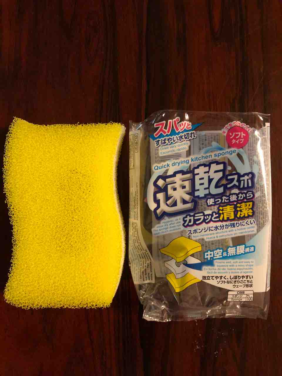 以前、この手のサンドイッチタイプのスポンジを使っていて、水切れが悪く、使い勝手いまいちだったので、パックスに乗り換えたという事情がありますが、今度はどうでしょう?