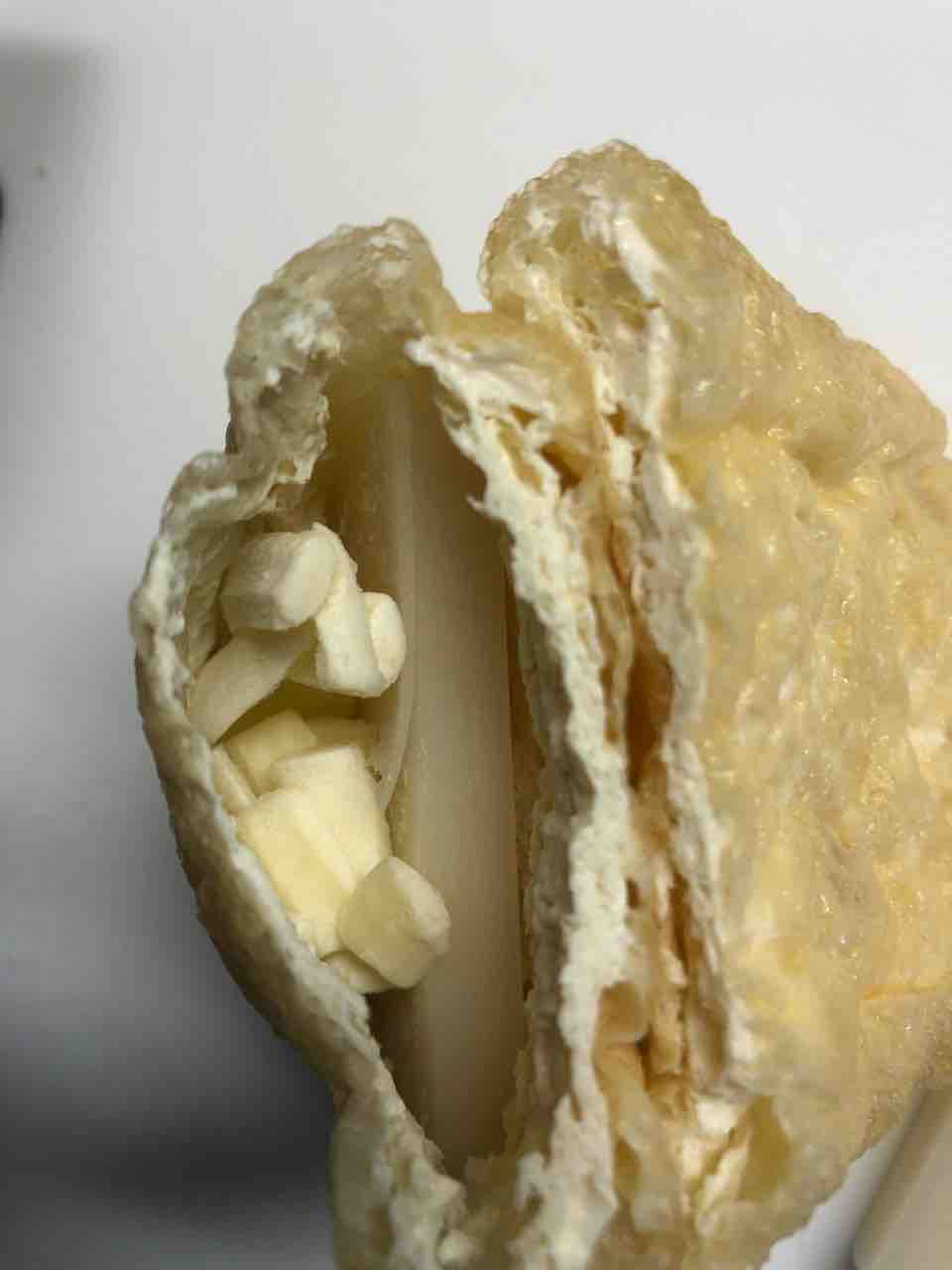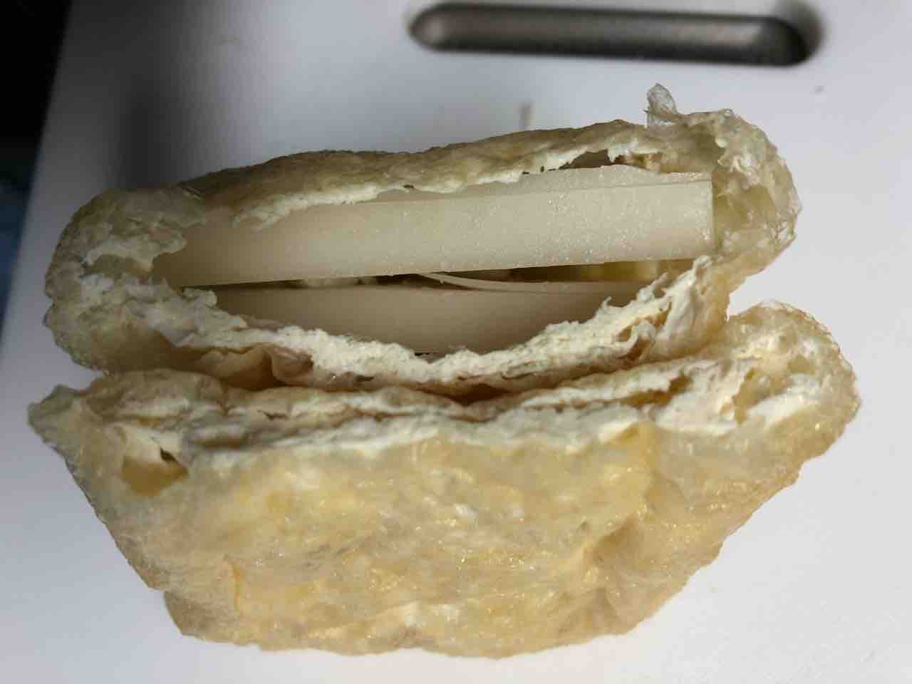 油揚げをほじほじして、ポケットを作り、そこに薄切り切り餅を入れ、その脇にシュレッドチーズを入れる。