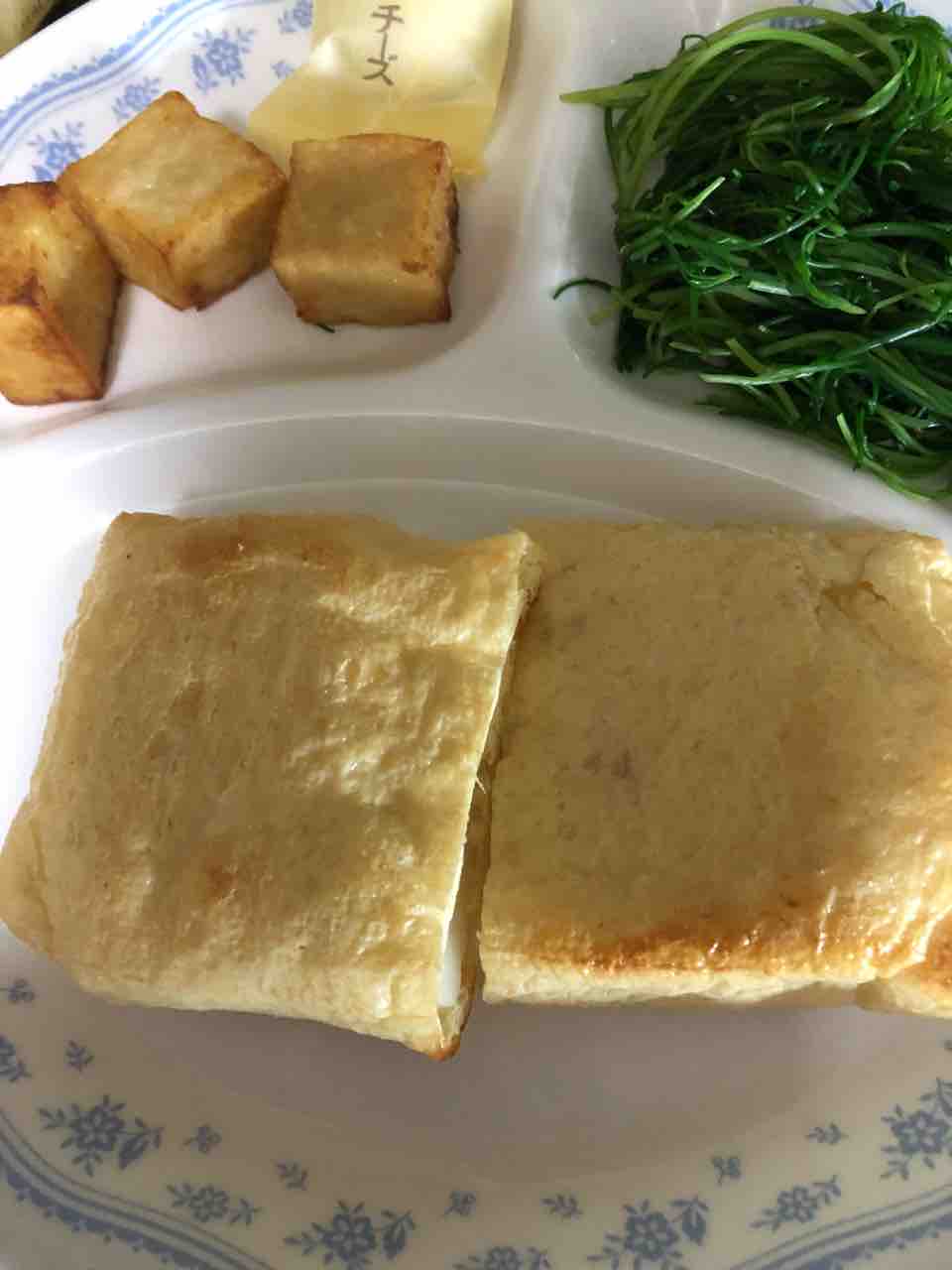 出来上がったのをお皿に乗せて、野菜等、適当に付け合わせして、油揚げ餅に醤油を垂らして、いただきます。