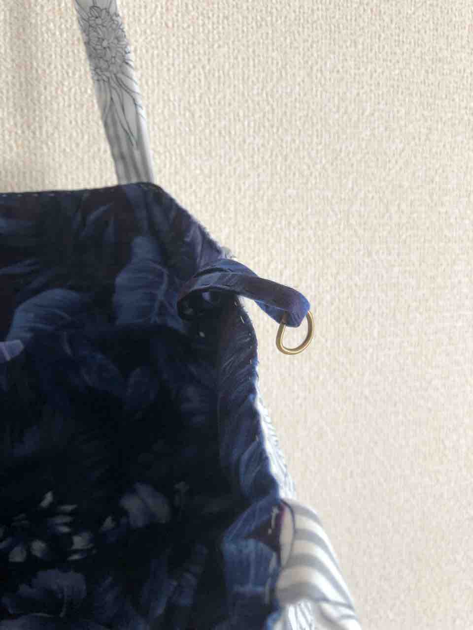 第二の工夫は昨日のブラウスのために作ったバイアステープの残りと、残り物の金具をつけて、バッグの中に縫い付けまして、PASMOを入れたナスカン付きケースをくっつけられるようにしました。