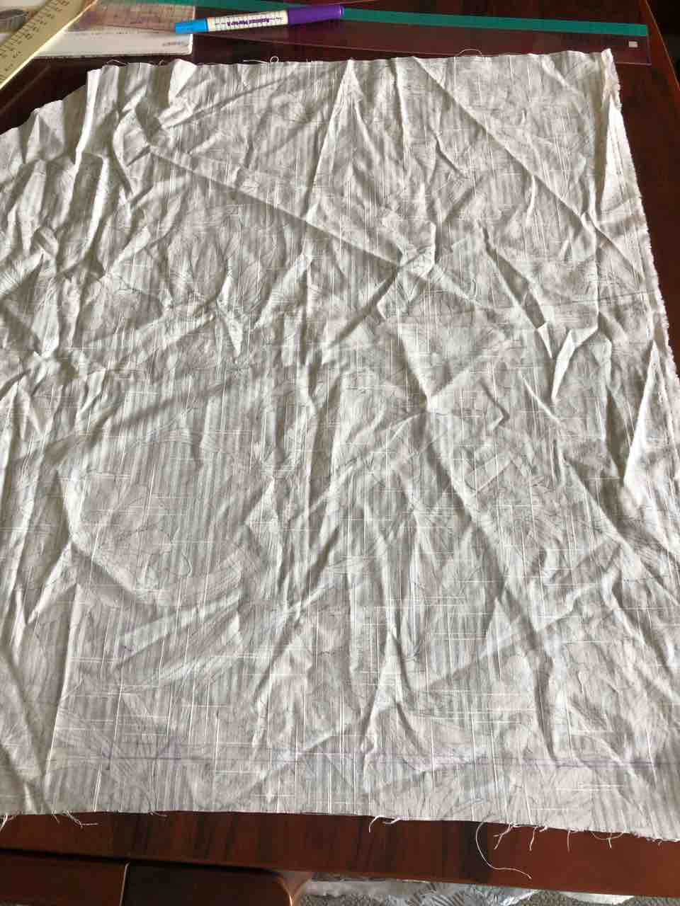 これじゃ、いくら何でもひどいよね、仕上がりしわくちゃになるわ。今日は洗濯物の乾きがものすごく良いので、テキストのサイズに合わせて裁断した後、水につけて竿に干して、アイロン要らず・・・の筈が、結局、アイロン掛けたのですが。