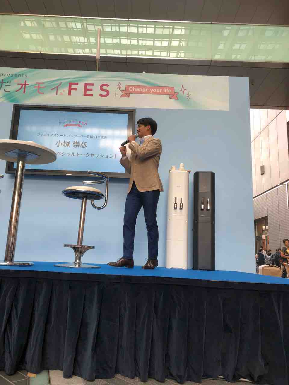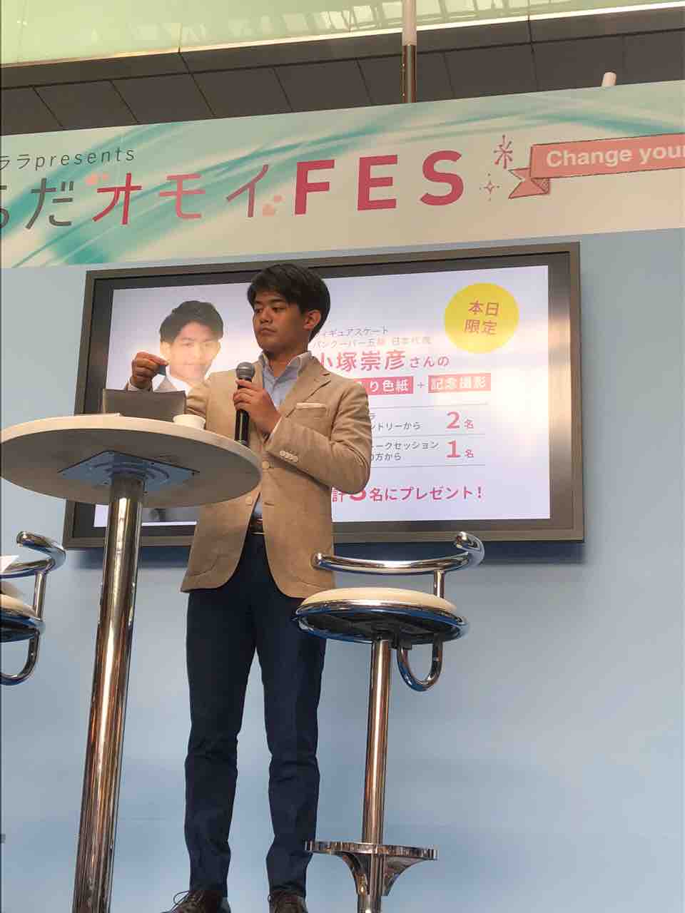 お話は美と健康がテーマなので、MCさん、小塚さんが美しい!と振る振る。耳を澄ますと、BGMには小塚さんのプログラムの楽曲が控えめに流れていました。やってくれるね〜、グッジョブ!👍