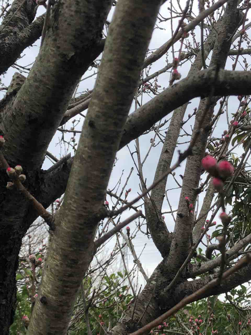 お昼を食べたコミュニティカフェ界隈と比べて日当たりが今ひとつだからか、山桜がちらほら咲き始めているレベルで、こちらはどうやら桃みたいで、それもこれからでした。
