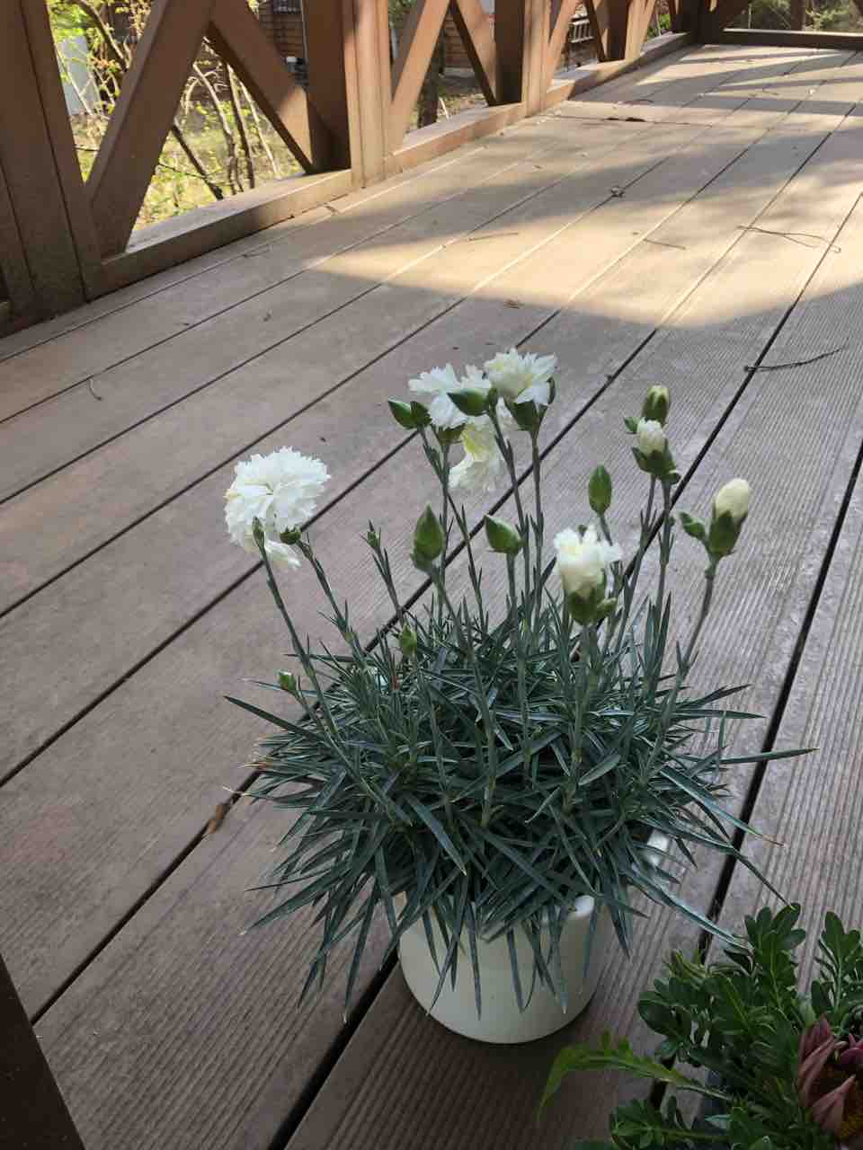 お店の人が白いのは香りが良いと言うので、お試し買いのカーネーション、1鉢200円なり〜♬