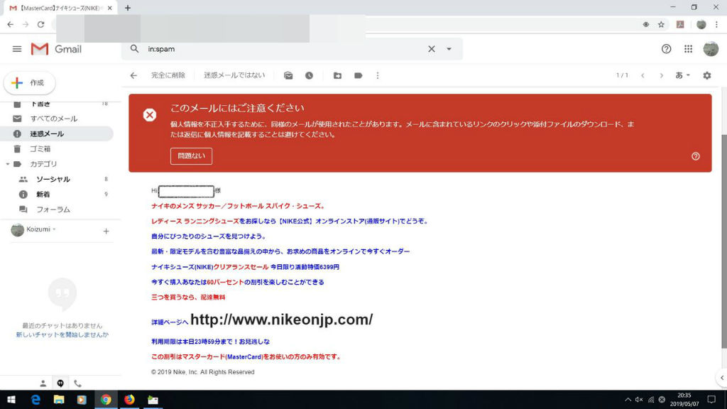 そして、Gmailのパソコン上の迷惑メールボックスではこのような警告画面が!