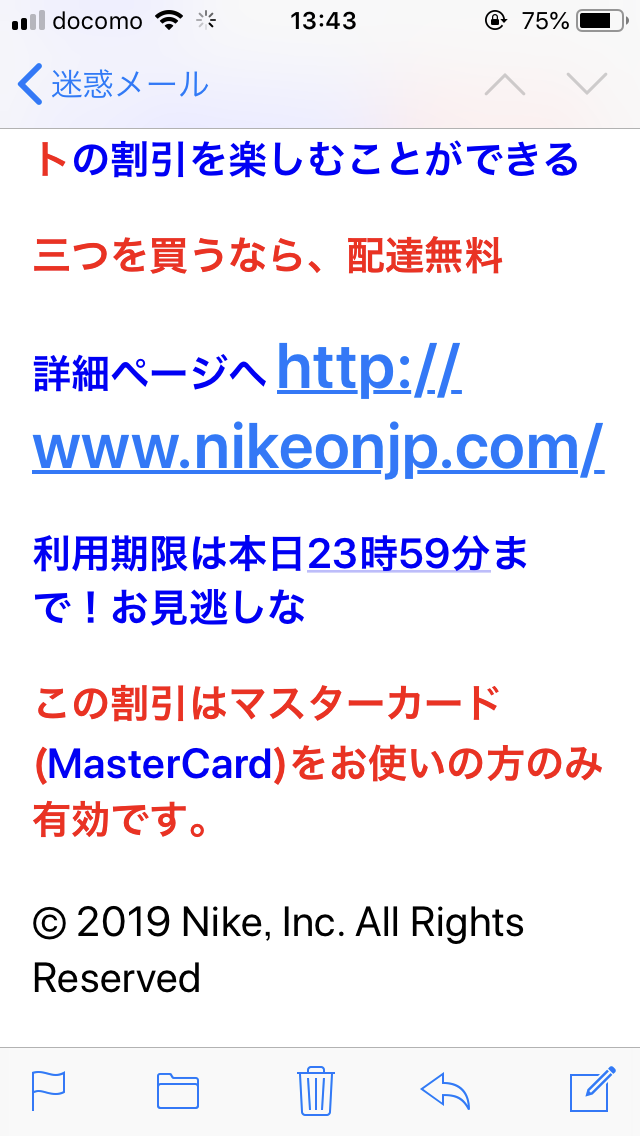 詐欺メールではおなじみの極度に短時間に区切った「今だけ!」の煽り文句がありますね。マスターカードをお使いの方だけに・・・・ってガラケーのメアドでマスターカードの登録なんてしてないぞ!