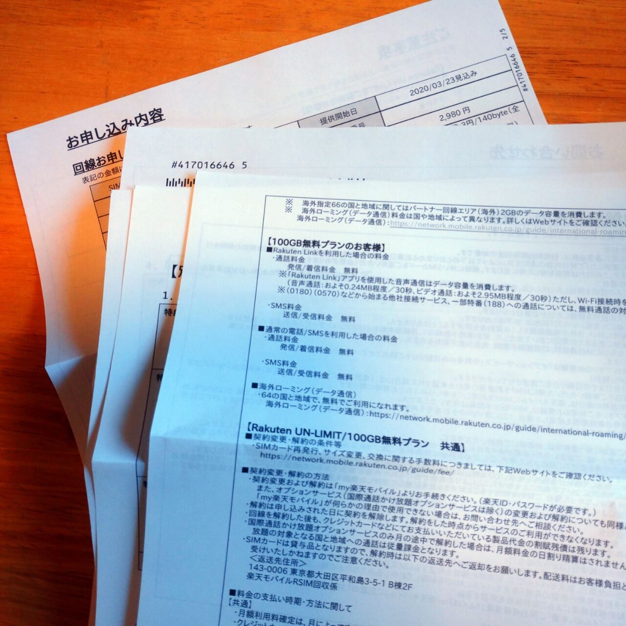 楽天UN-LIMITの契約書類です。SIMと一緒に送ってくれりゃ一度で済むのにねぇ。