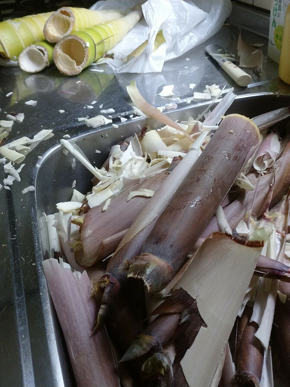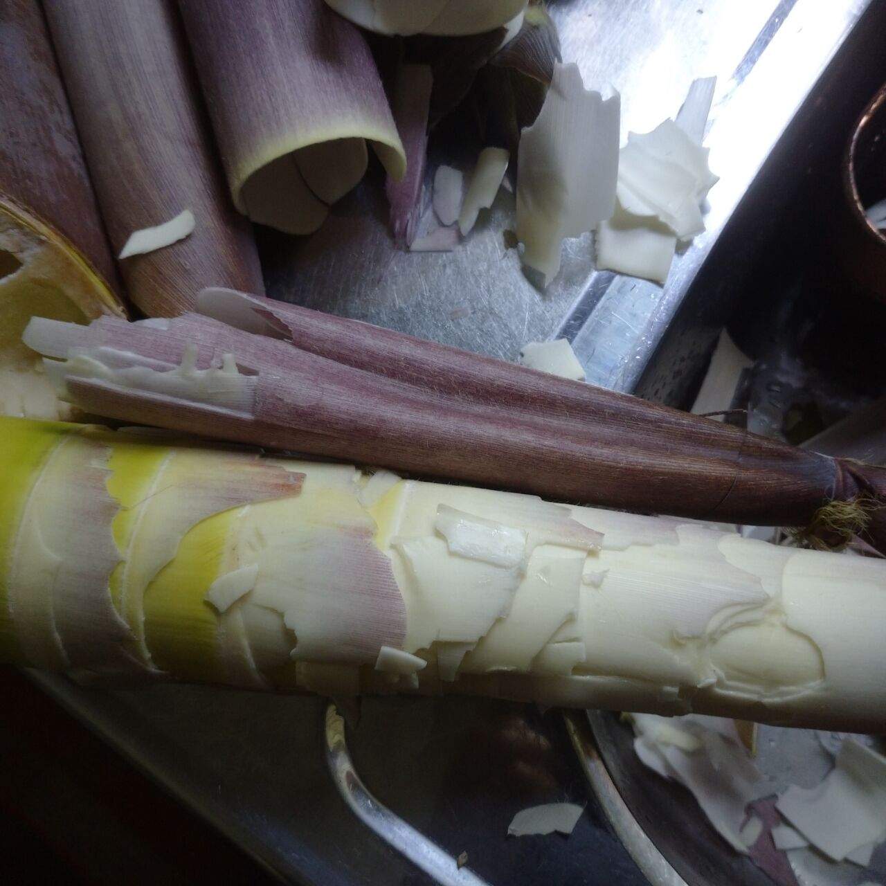 普通のタケノコの場合、えぐみを除くための灰汁抜きは皮をつけたままする方が良いらしいですが、このタケノコ、まずは皮をむいてからとの事。