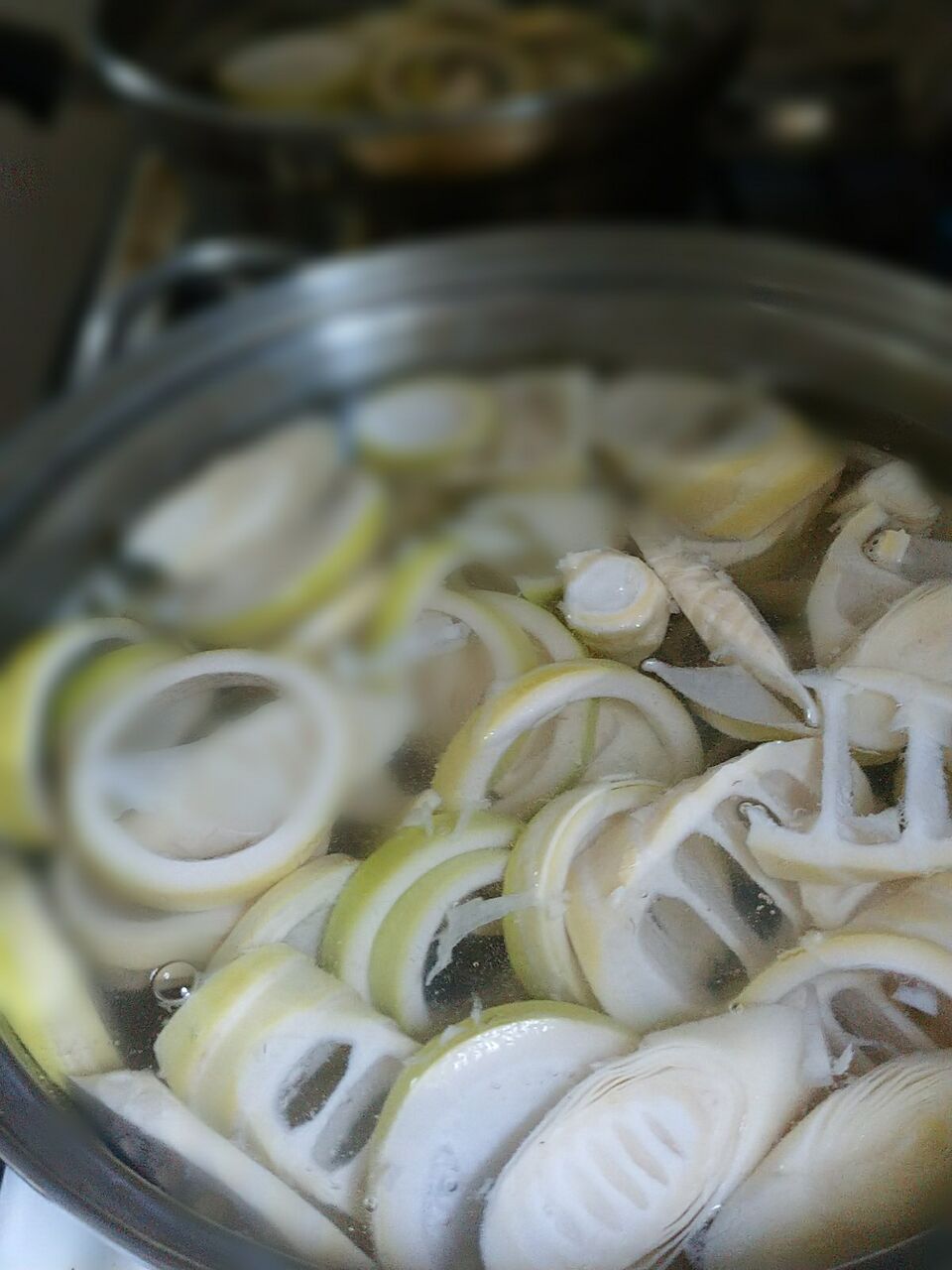 友人が教えてくれた通り、下の太い方は輪切りにして、上のよりやわらかな部分は斜めに切りまして、鍋に入れて灰汁抜きの湯がき。