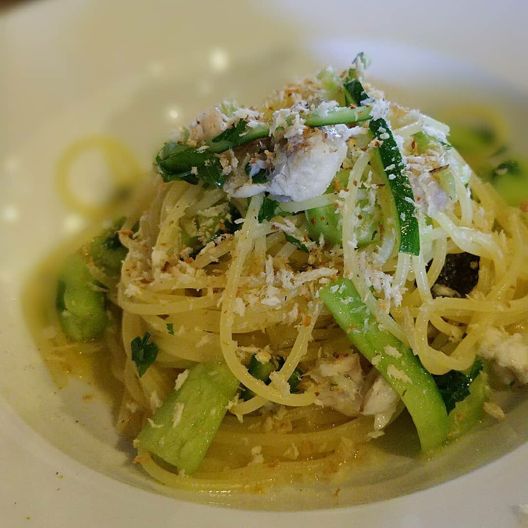 白身魚ときゅうりのパスタというのをメニューで見た時はどんなものかと思いましたが、棒状に切ったきゅうりがガーリック風味で炒められていて、さっぱりしつつもお味もしっかりしてなかなか美味。