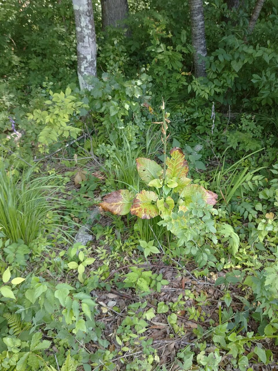 百合の葉と言えば、細長く、ややつやがあるイメージがありますが、ウバユリの茎の下の方に固まった葉っぱは何だかイモっぽいです。ウィキペディアによると、ユリ科ウバユリ属だそうです。