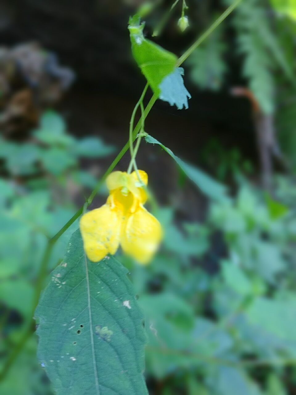 橋のそばで、赤紫しか見たことなかったツリフネソウ、赤紫の中に珍しい黄色い花を見つけました。キツリフネと言うそうです。