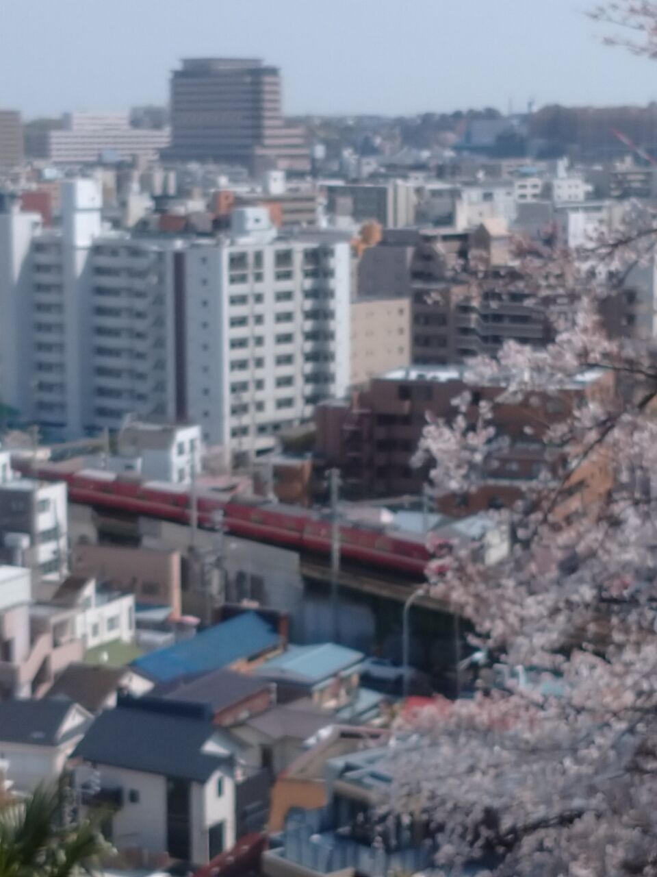 (ピンぼけになりましたが、桜と赤い電車)