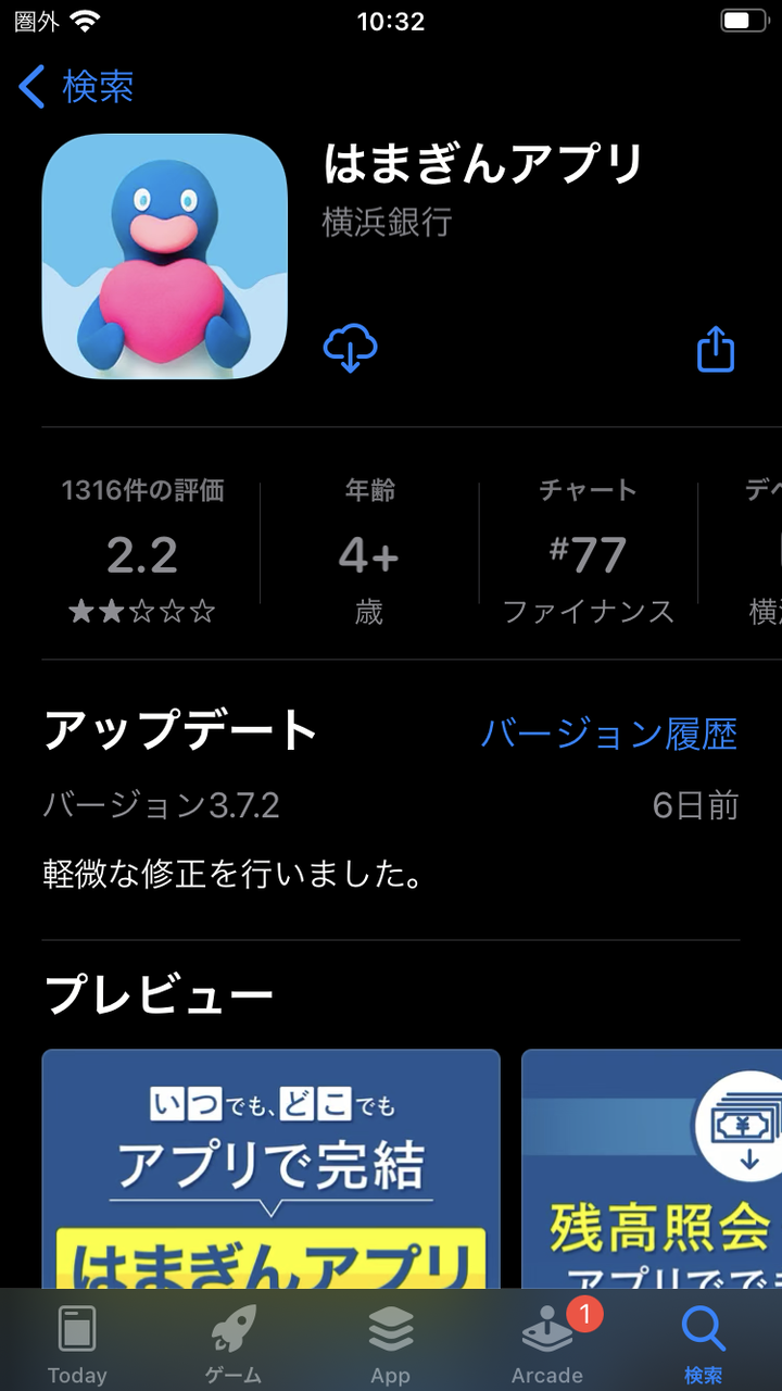 一方、郵便局の通帳アプリは、アップルストア画面を見ると、どこにも入手ボタンがないのですが、画面上にある小さな雲から下向き矢印が出ている見づらいアイコンをタップすると、インストールしてるという円がくるくる回って、開くとなります。
