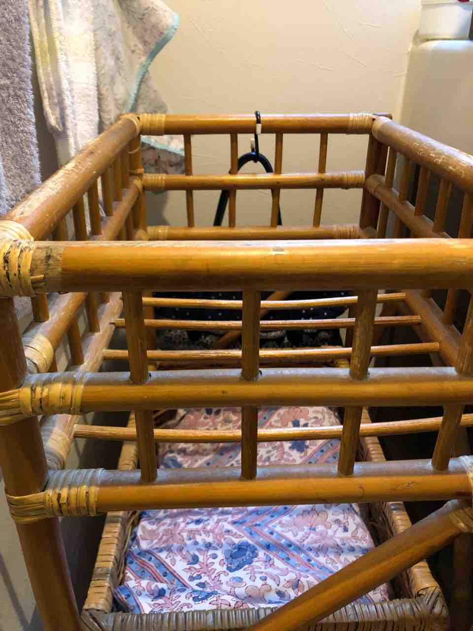 そして掛ける、洗面所にある中途半端な凸凹スペースにちょうどいいやと置いているキャスター付き籐の脱衣かご兼フェイスタオル入れの横っちょに、こちらからは見えないように。