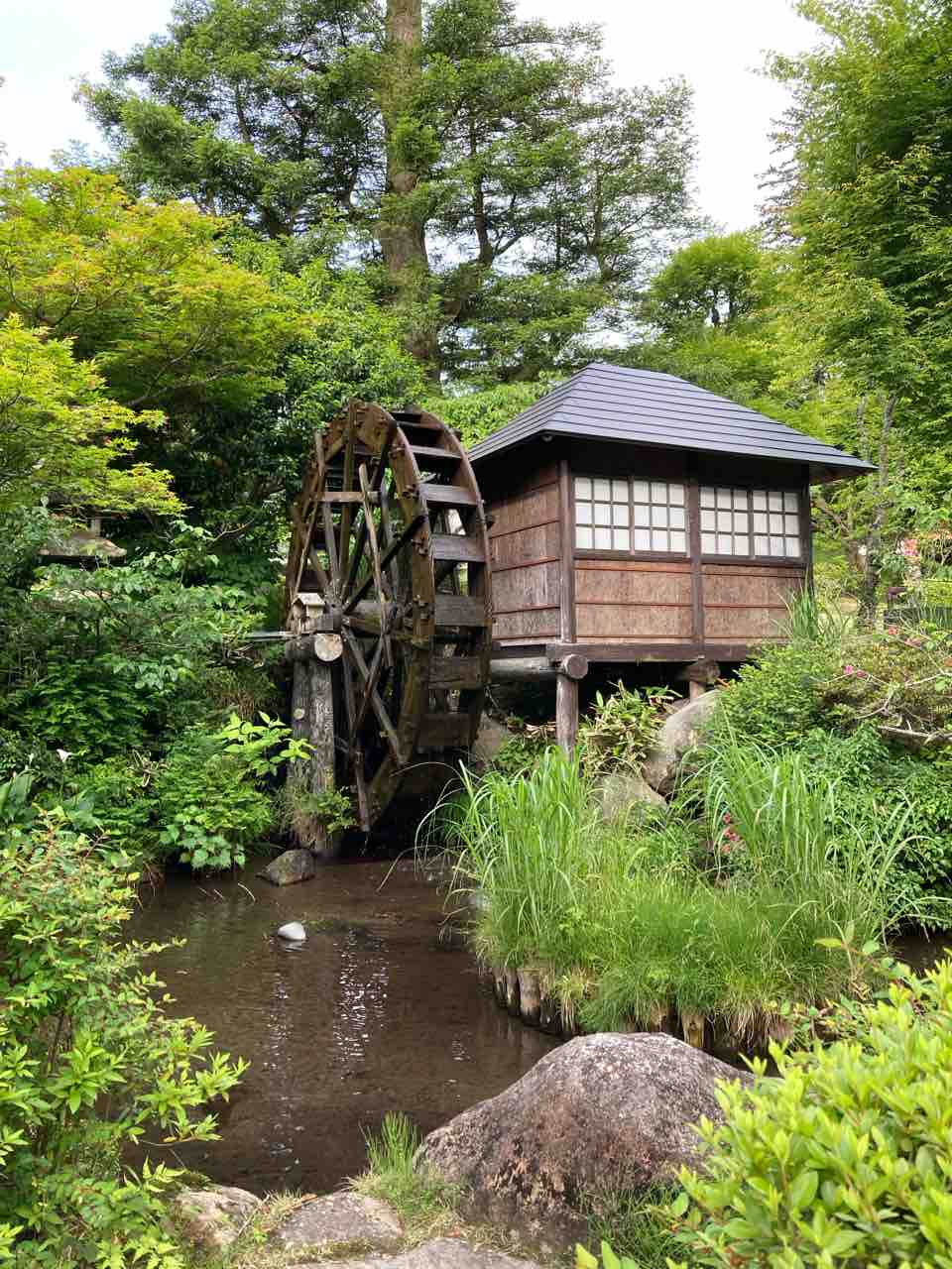 朝の散歩 ホテルの庭(傾斜面)にある水車