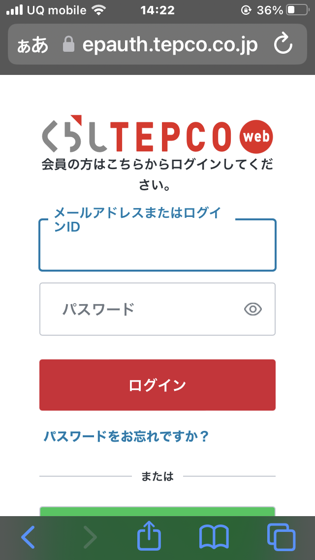 買電の方はくらしテプコ。この画面から入ります(パソコン画面には個人情報が入ってしまってるのでスマホ画面です)