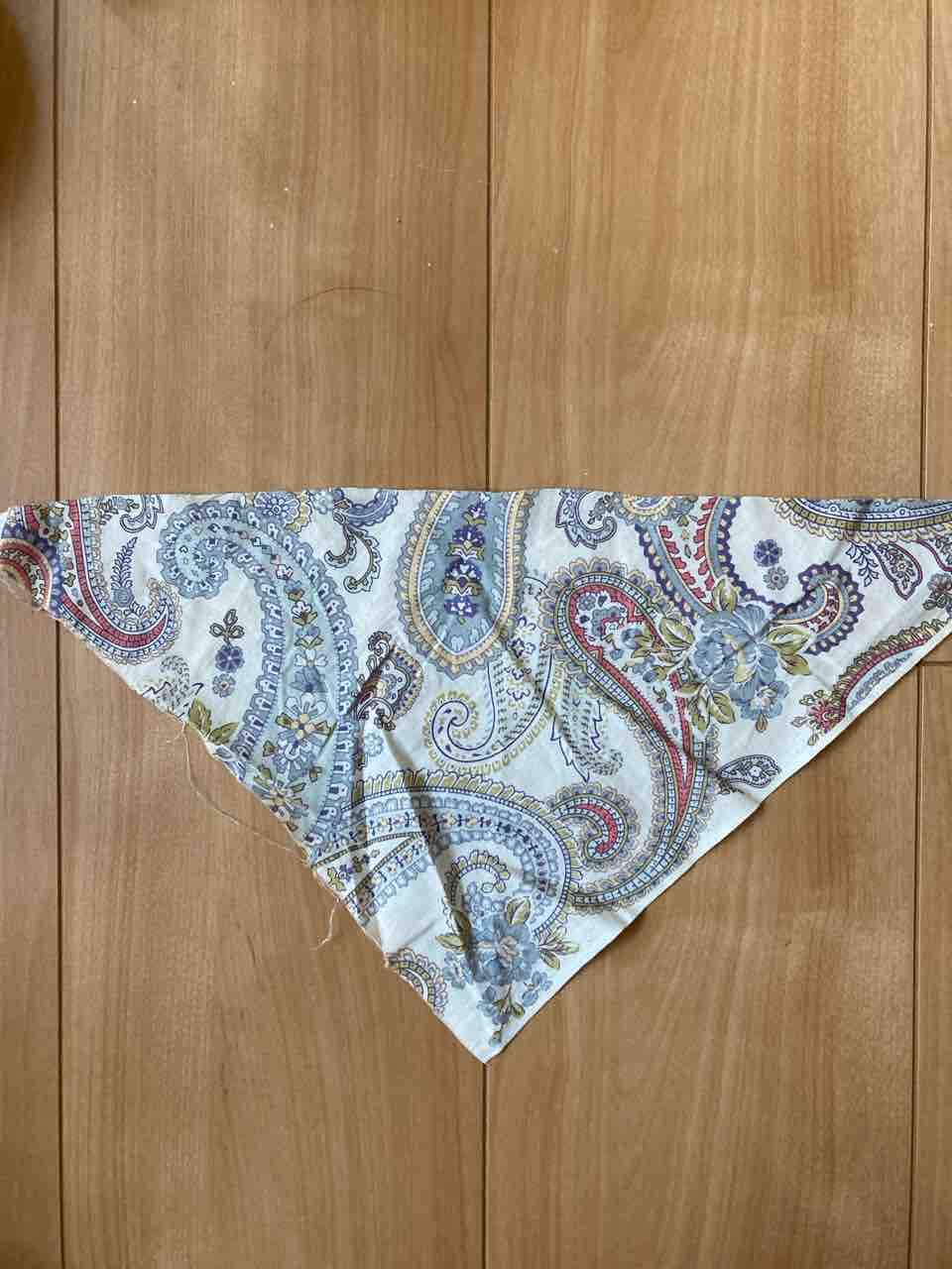 バイアステープを取った残りの部分らしく三角で、一辺は布端で始末の必要がありませんが、2辺は切りっぱなしです。