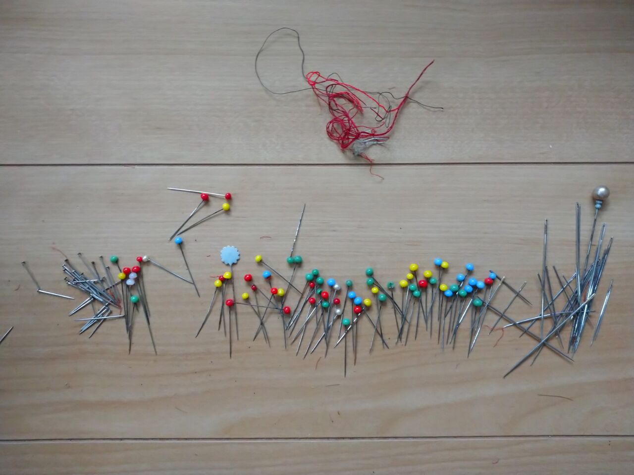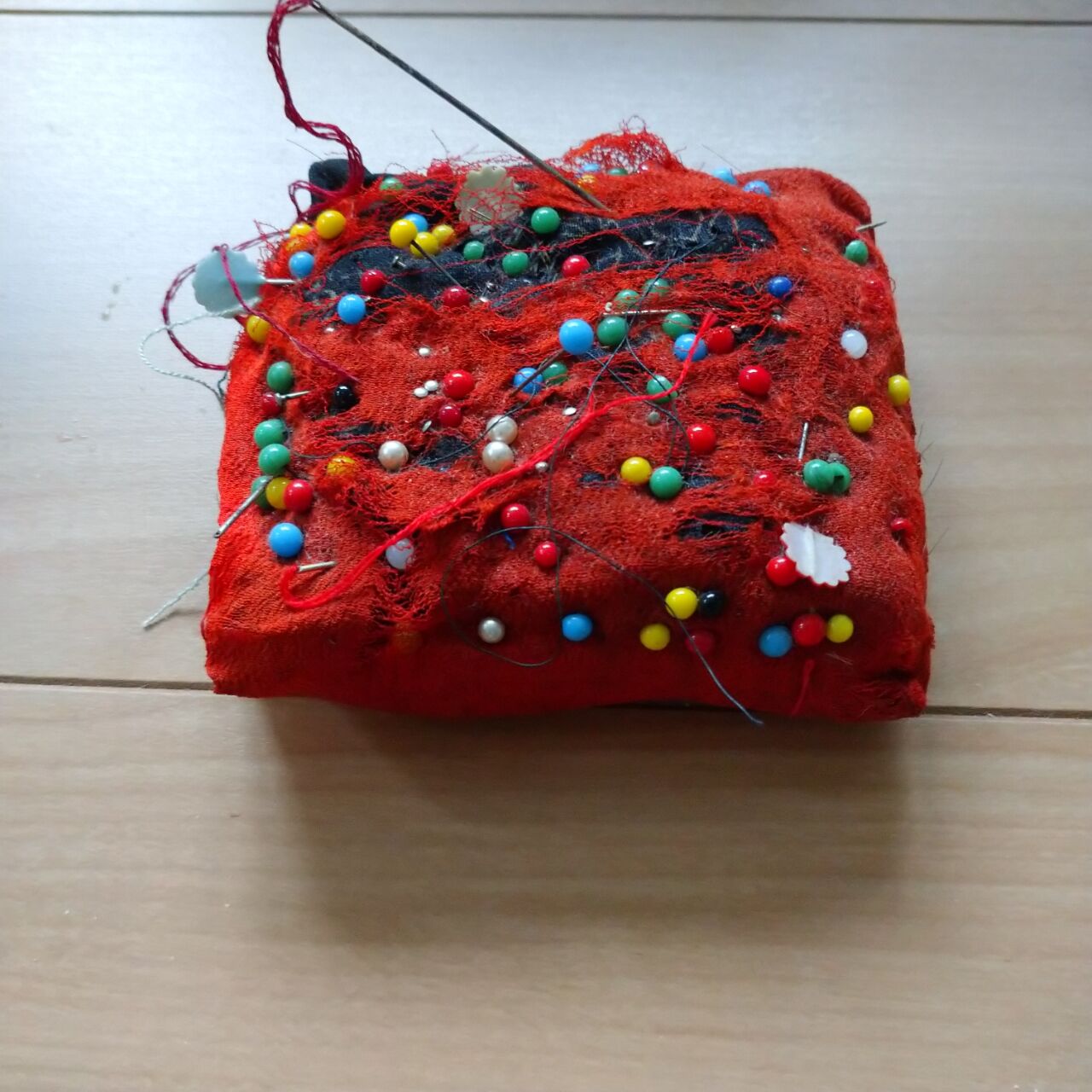 極力取り除いたつもりですが、もしかするとまだ潜んでいる針があるかも知れない、そこはお許しいただくとして、針を抜いた針山は燃えるごみの日にお別れです。