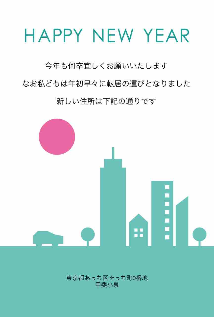 昨年の年賀状、実際の印刷は違いますが、こういう感じで年賀の挨拶と共に、年明け早々には転居することを書いて新住所を記載しました(旧住所は宛名面に印刷)。