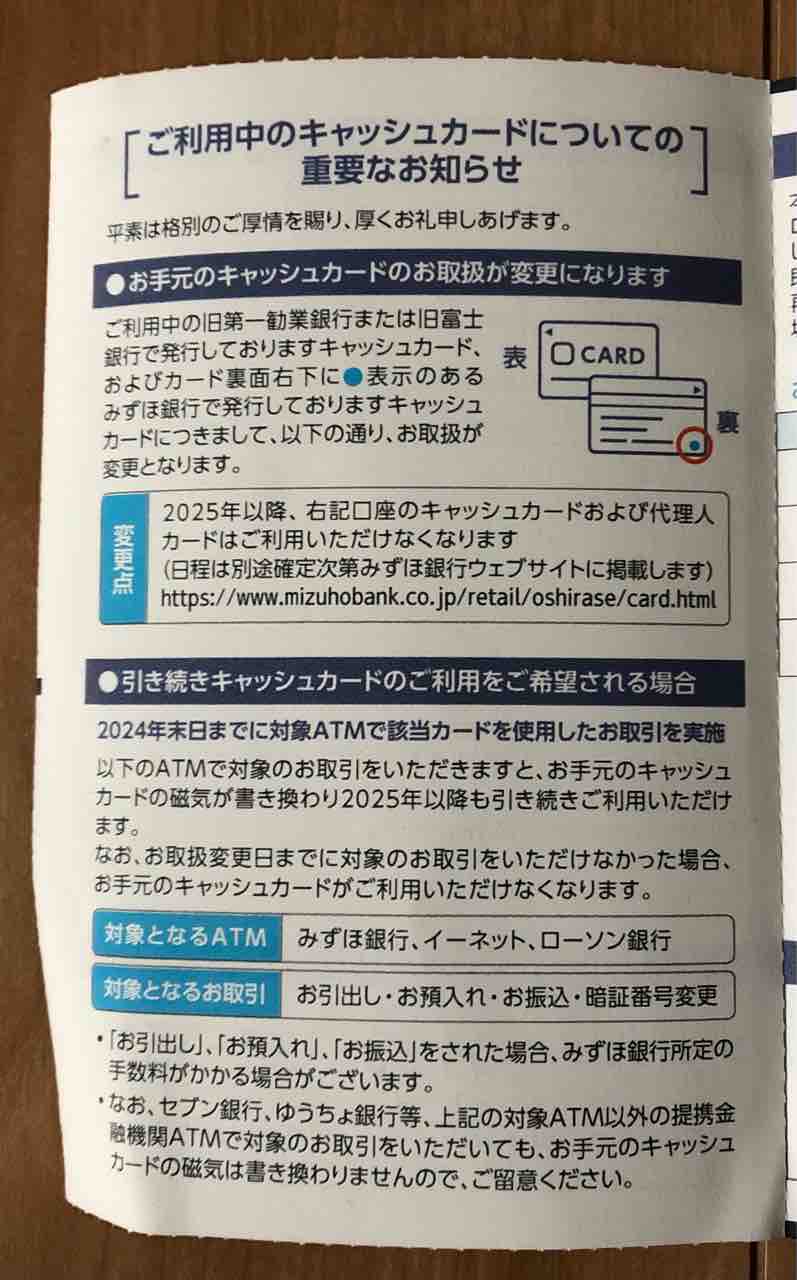 この口座はもっぱら配当入金用として放置していましたので。年に二回くらい記帳する時はほぼ混み合う事のない記帳専用機を通していて、キャッシュカードを持ち歩くこともありませんでした。