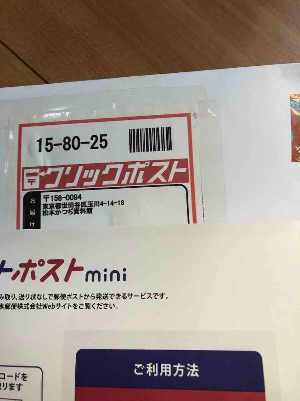 上の写真、上の封筒が松本かつぢ資料館宛てのクリックポスト、下の封筒はメルカリの匿名配送で使うゆうパケットポストミニです。