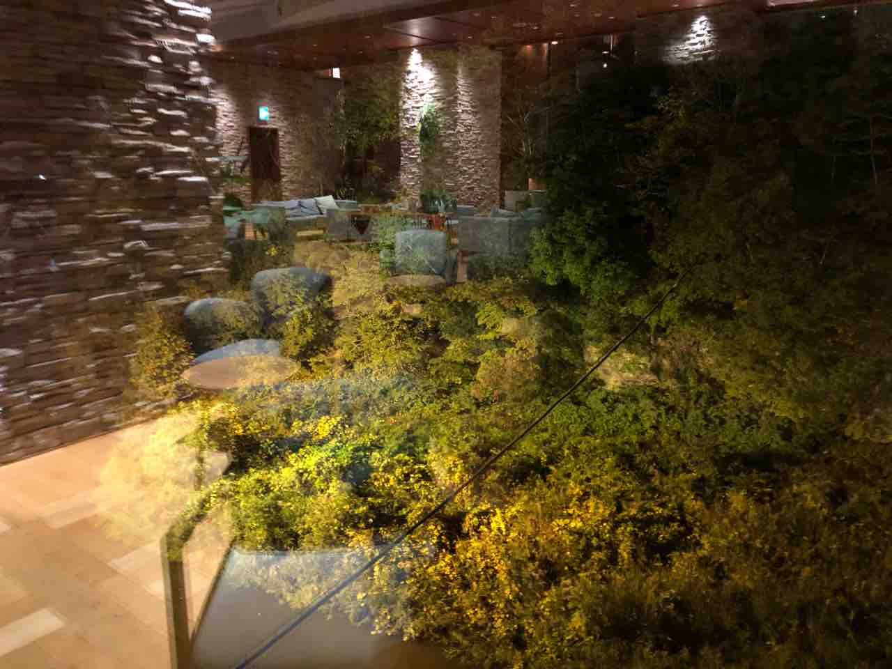 外はライトアップ。ガラス戸に室内が映り、夜はちょっと不思議な見え方になるラウンジの窓辺。