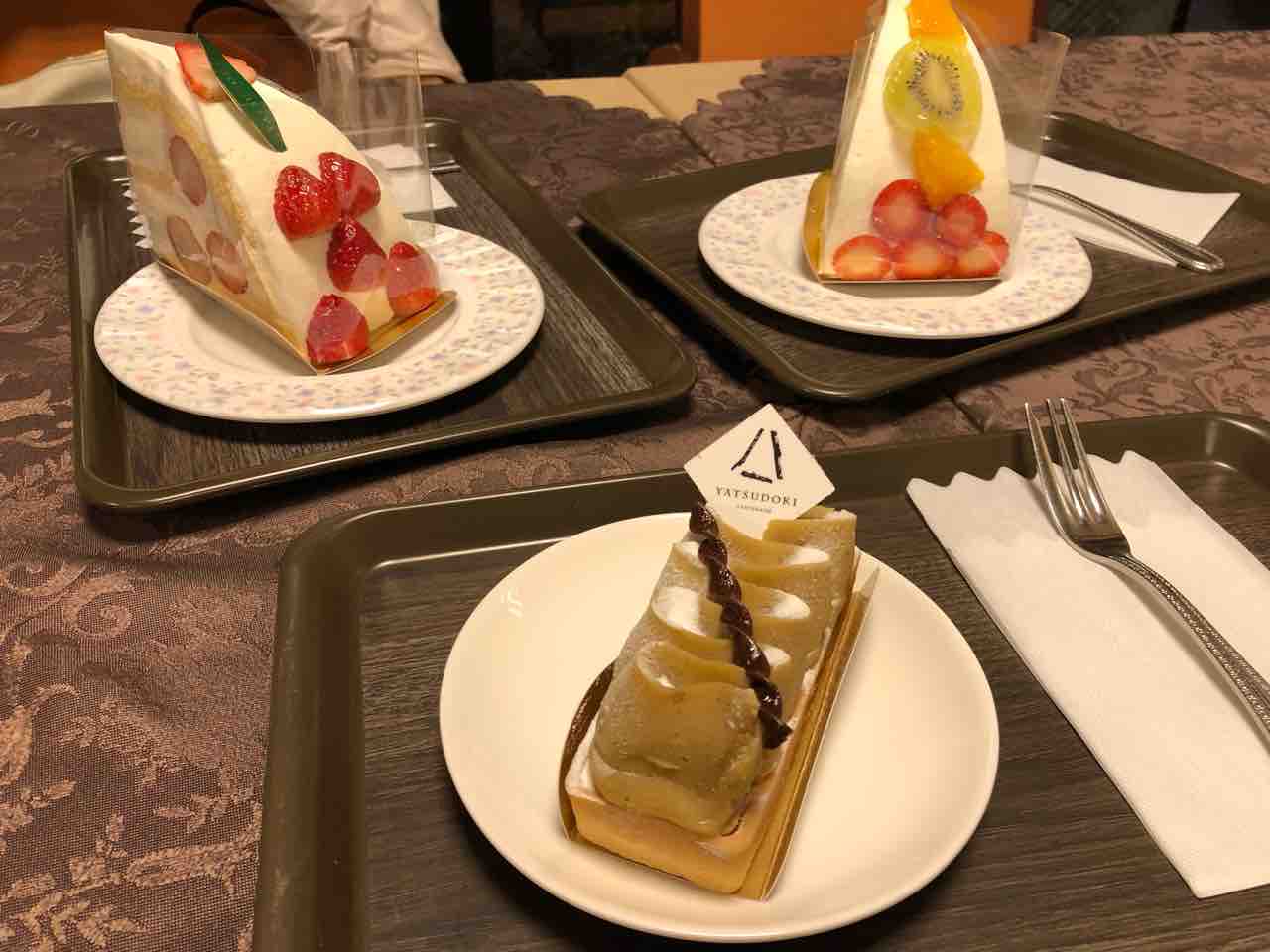 友人たちは彩りの美しいスポンジにクリームとフルーツ。私はモンブランのタルト。三人で少しずつ分け全部食べましたが、そう言う事も出来る適度に放置してもらえる気楽さが良かったです。