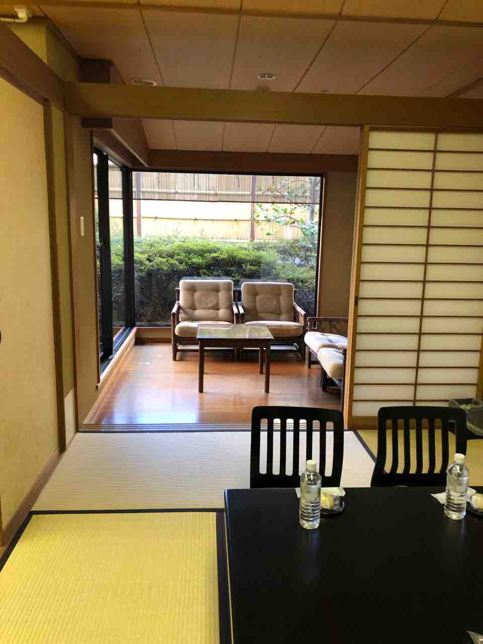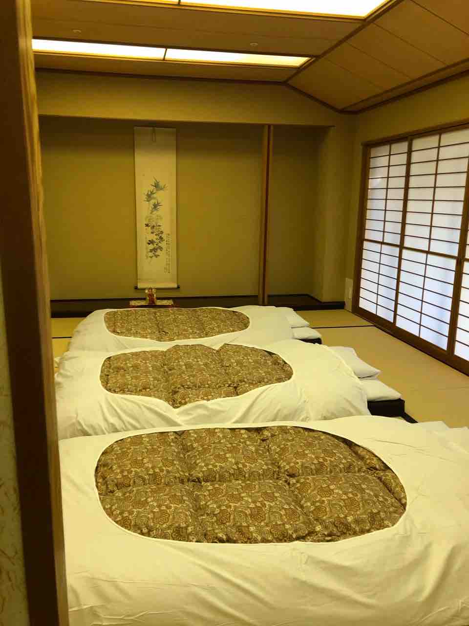 部屋は坪庭付きのリビングあり、茶の間スペースあり、そして既に布団の敷かれている本間と言う部屋ありでなかなか立派です。バス、トイレは別々。