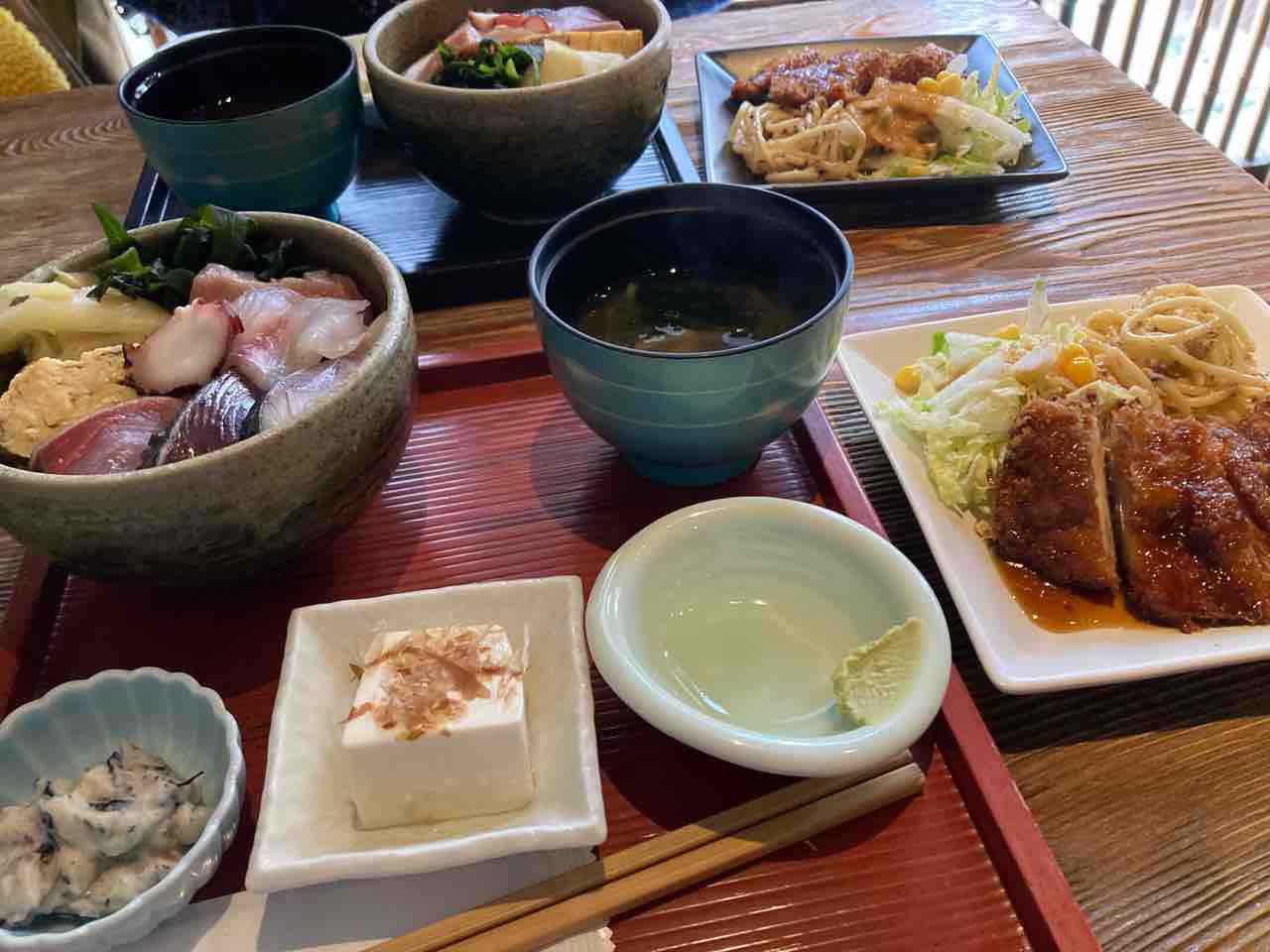右端のチキンカツがついて、見た目コンパクトですが痩せ型老人たちにはガツンと来る量でした。