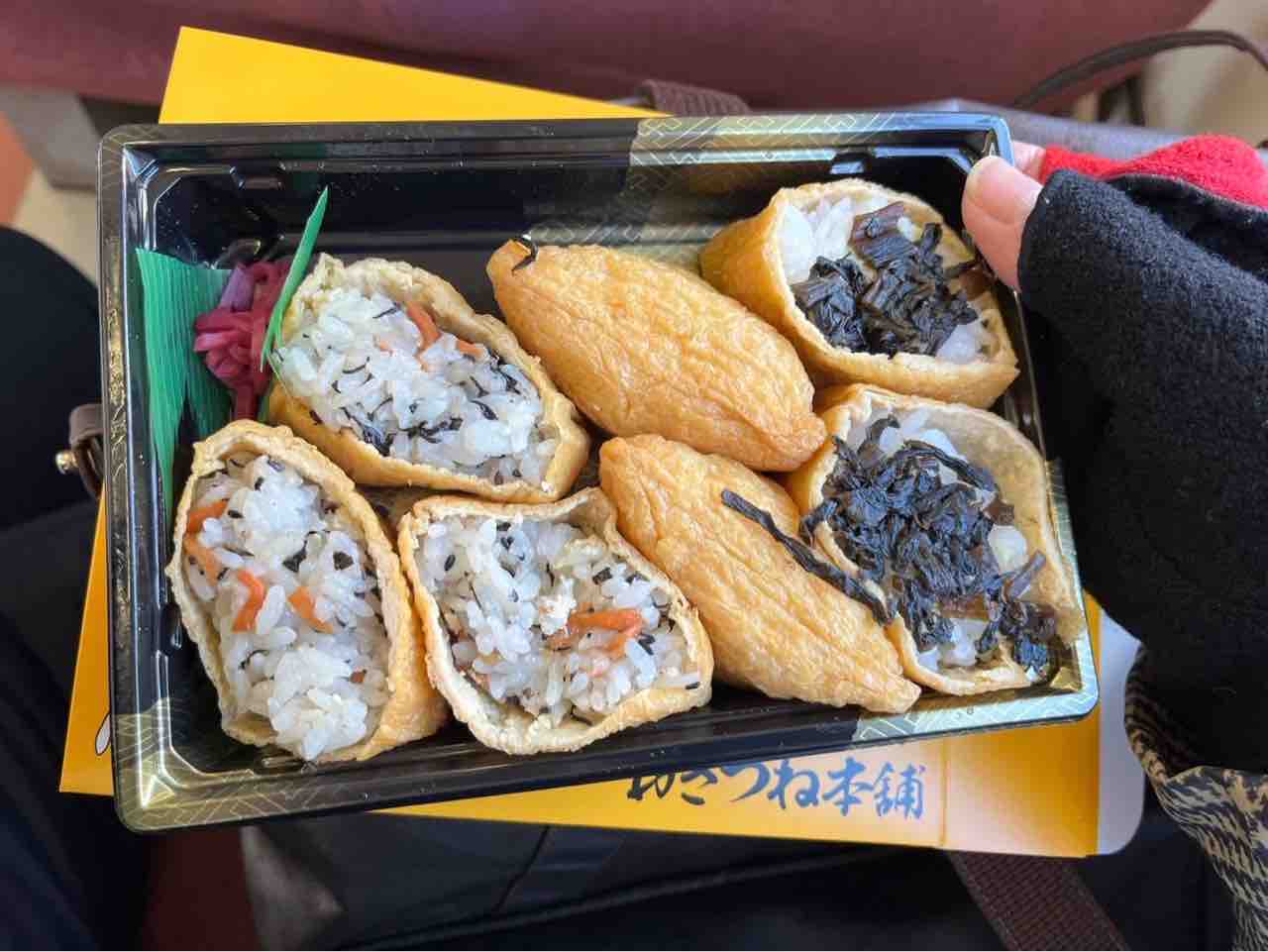 境内で100円引きの掛け声に釣られて買った稲荷寿司、あまりの寒さにどこかに腰掛けて食べようと言う気は全く起きず、車内でいただきました。
