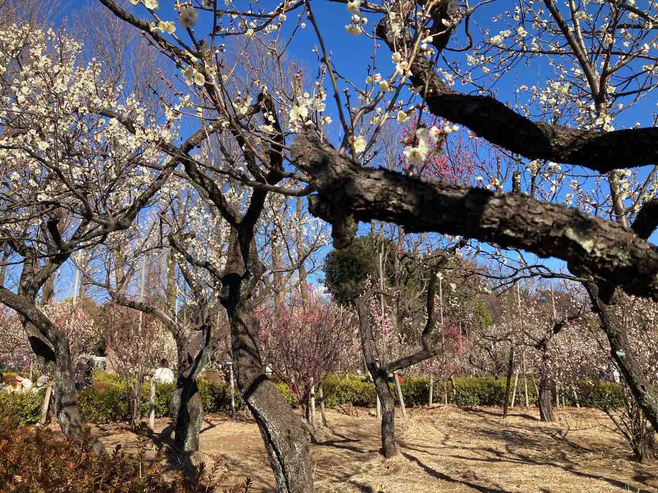 2年前の京都の城南宮での観梅より混み合ってるんじゃない?(何しろ入園料無料ですし😆)な梅まつり会場で、友はお祭り価格の花苗を調達。