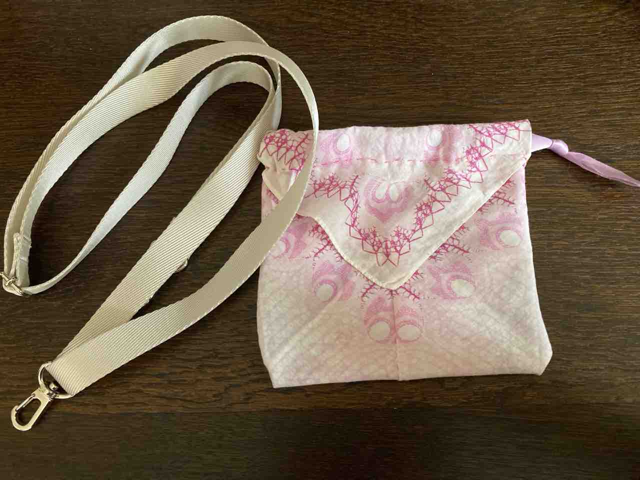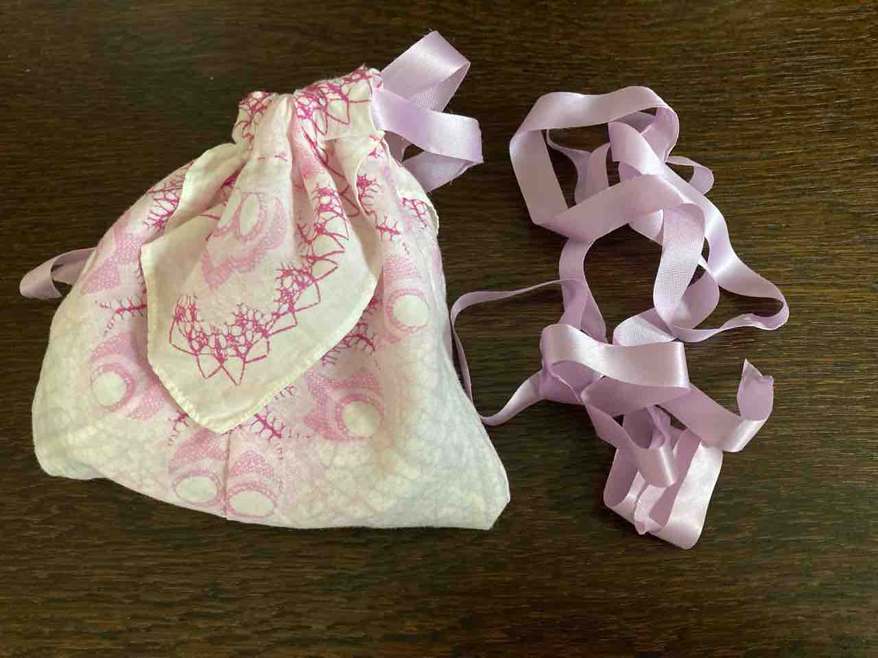 昨日ご披露したサコッシュですが、肩ひもを外してトートバッグの中に入れるのに、そのままだとまとまりが悪いし、淡色なので汚れそうということで収納用袋が欲しくなりました。