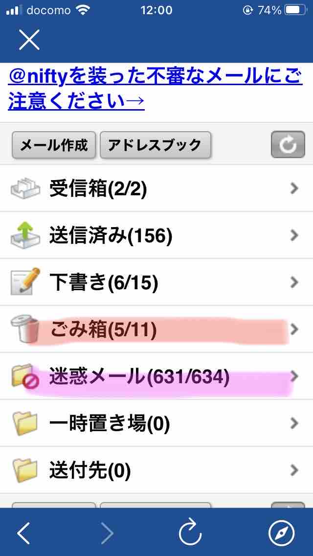 niftyのwebメールはスマホでもパソコンでも見ていますが、スマホの画面はこんなです。