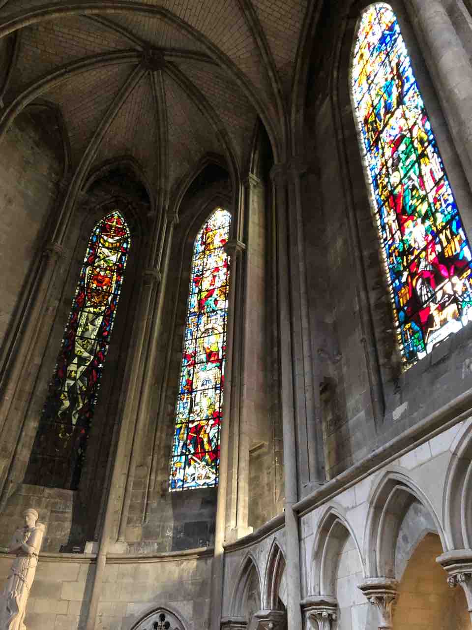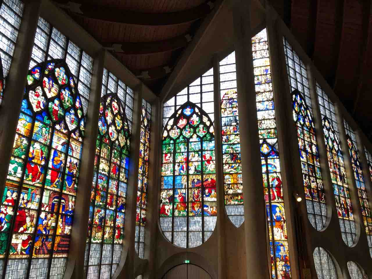 モダンなジャンヌダルク教会内のステンドグラスはドイツ軍攻撃前に外され保管されていた由緒正しいものを使用。