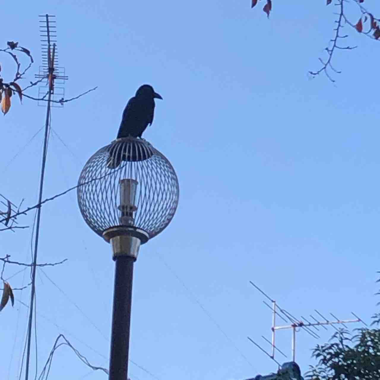 カラス君が球状の街路灯の上を陣取って夕方を待っているようです。一羽だけでガァガァ言わないと結構かわいい。